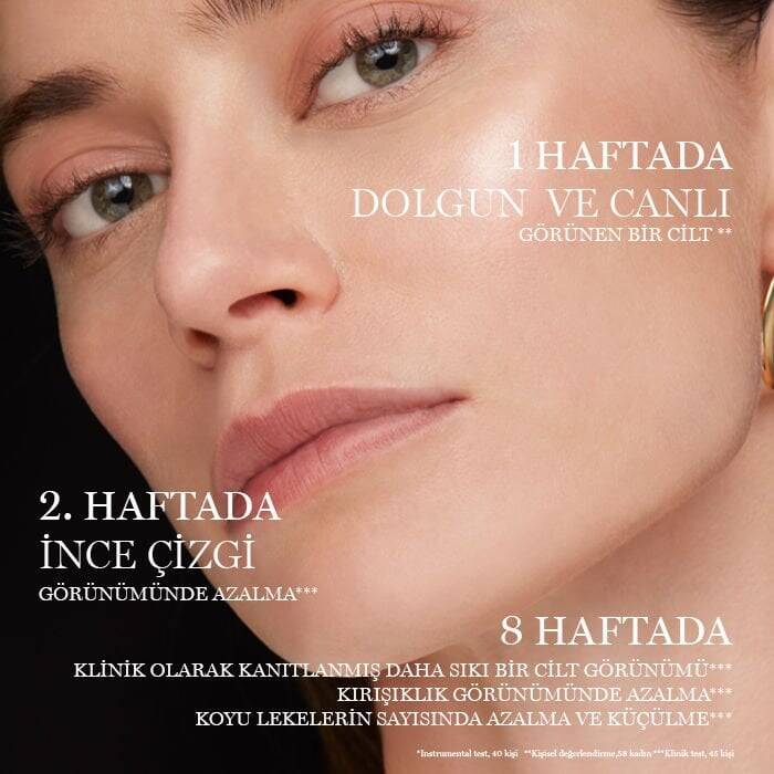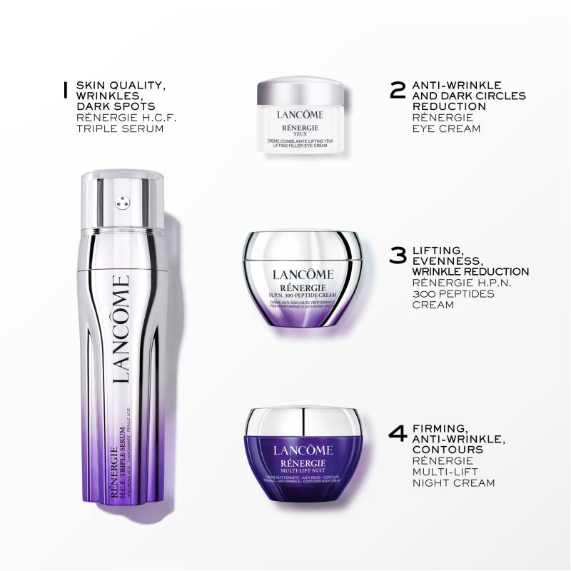 ÜRÜN AÇIKLAMASICildinizin her katmanda yenilenmesini sağlayan üçlü serum, gündüz, gece ve göz kremlerinden oluşan cilt bakım rutini setiyle yüksek performanslı yaşlanma karşıtı bakımını keşfedin. Lancôme'un inovasyonu Hyalüronik asit, Niasinamid ve Ferülik asidi tek formülde birleştirdi. Lancôme'un üç aktif bileşeni tek formülde içeren ilk serumu.Set içeriği: • Rénergie Triple Serum 50 ML • Rénergie Göz Kremi 5 ML • Rénergie HPN 300 Peptit Krem 15 ML • Rénergie Multi-Lift Night Gece Kremi 15 ML1. ADIM: Rénergie H.C.F. Triple Serum 50ml, üç serum etkisini tek formülde birleştirir: Hyalüronik Asit, C + Niasinamid ve Ferulik Asit . Cildi her katmanda yenilemek için yüksek performanslı yaşlanma karşıtı serum: Katman 1: geliştirilmiş cilt hacmi ve kalitesi Üçlü bir dozda +%37 daha fazla tonisite* Katman 2: hızlı ve aşamalı çizgi ve kırışık düzeltme** Katman 3: koyu noktalar üçlü düzeltme** 2.ADIM Rénergie Göz Kremi 15ml: Yeni nesil Hyalüronik Asit ve Keten Tohumu ekstresinin içerdiği Peptitlerin birleşimi. Anında tazelenmiş bir göz çevresi, düzenli kullanımla kırışıklık görünümünde azalma, göz kapaklarında lifting etkisi ve koyu halka görünümünde azalma. 3.ADIM: Hyalüronik Asidi, Niasinamid’i ve güçlü yaşlanma karşıtı özlerden elde edilen 300'den fazla peptit türüne sahip Rénergie HPN 300 Peptit Krem 15ml. Kırışıklık görünümünü azaltır ve daha eşit bir cilt tonu sağlar. Yüz ve boyun için kullanımı uygundur. 4.ADIM: Rénergie Multi-Lift Gece Kremi 15ml, cildi pürüzsüzleştiren besleyici krem. Cilt nemle dolgunlaşır, daha sıkılaşmış hissedilir